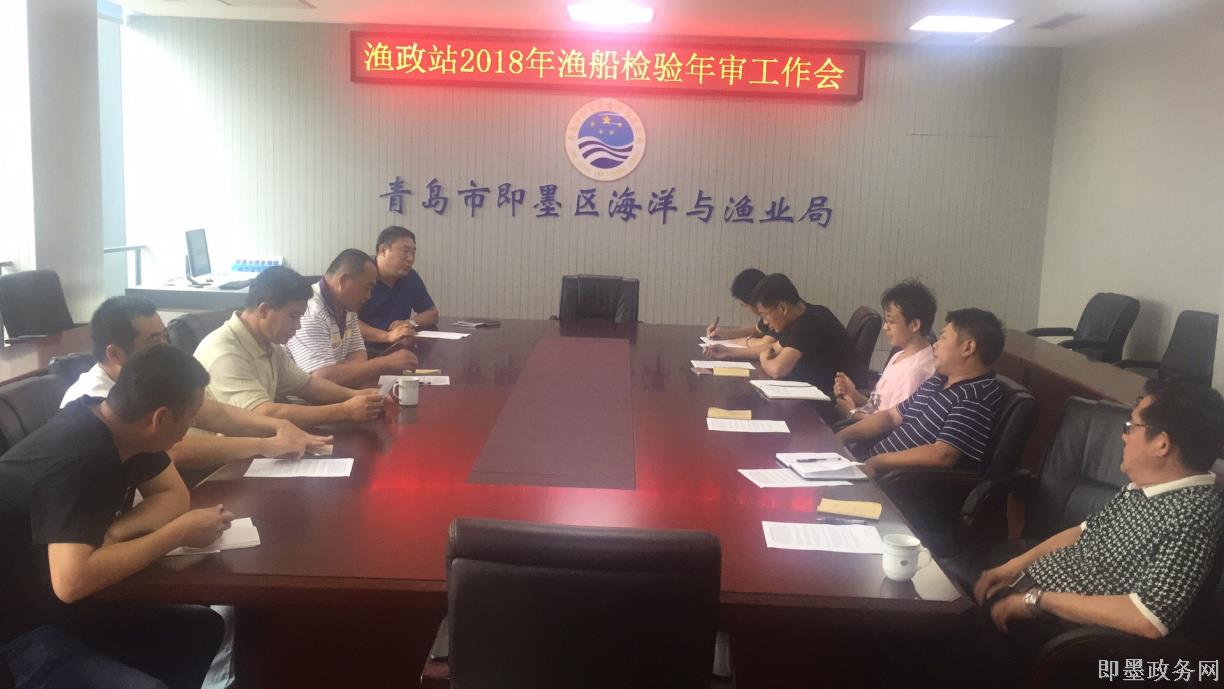 2018??日,青岛市即墨区海洋与渔业局渔政站组织渔船检验年审相关工作人员召开?018年渔船检验年审工作会议,对今年渔船检验、捕捞许可证年审、渔业互助保险的办理等工作进行了安排,明确了责任分工,要求按照相关规定及时进行渔船检验、证书年审,确保2018年渔船检验年审工作顺利完成?/p>